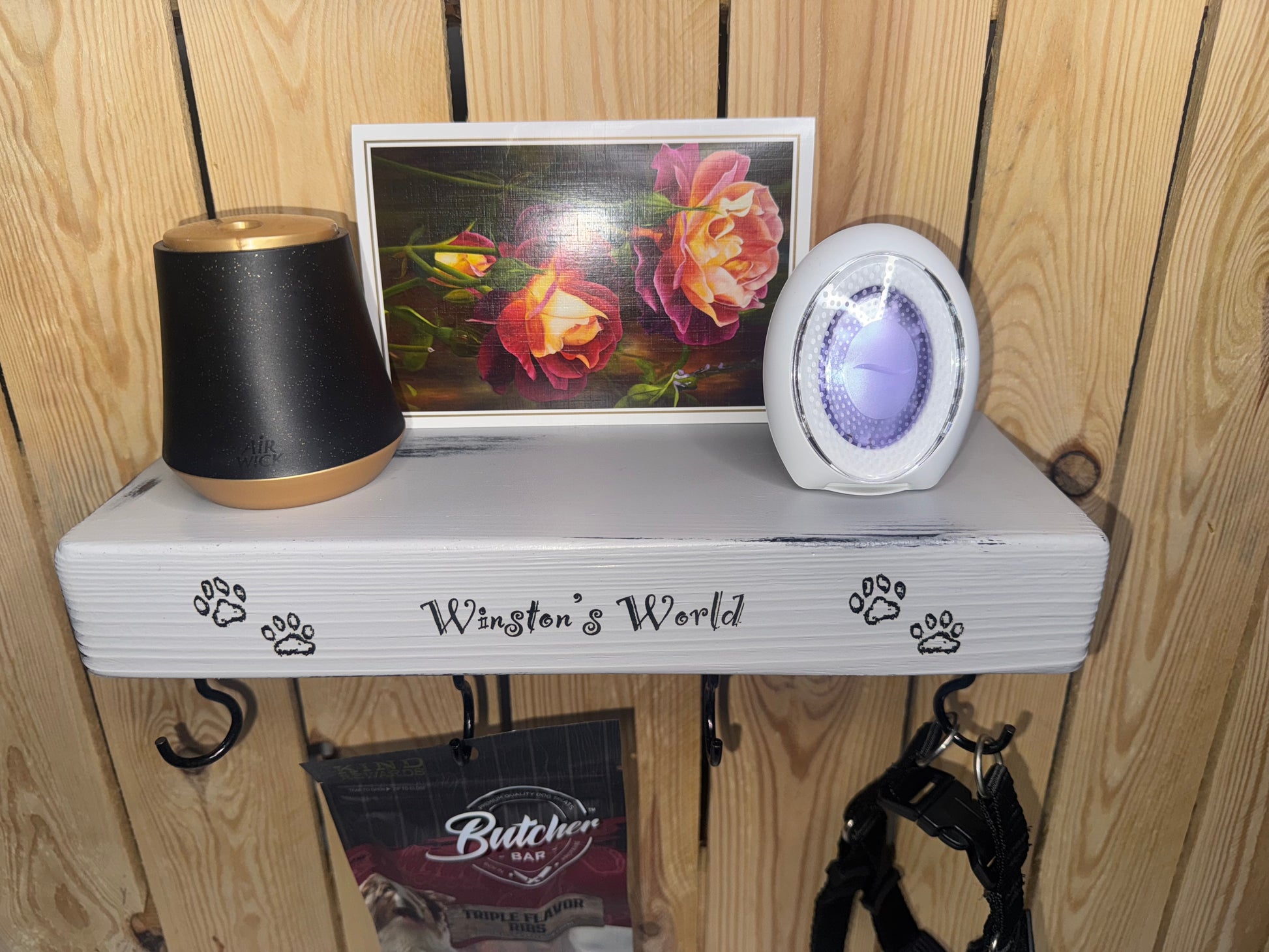 This custom floating dog shelf is made of 100% wood and includes 6 hooks for easy organization. Message me to choose the words, 2 pictures, and colors you want to personalize it for your furry friend. Comes with easy installation directions for a hassle-free experience. Keep your space tidy and stylish with this unique shelf.