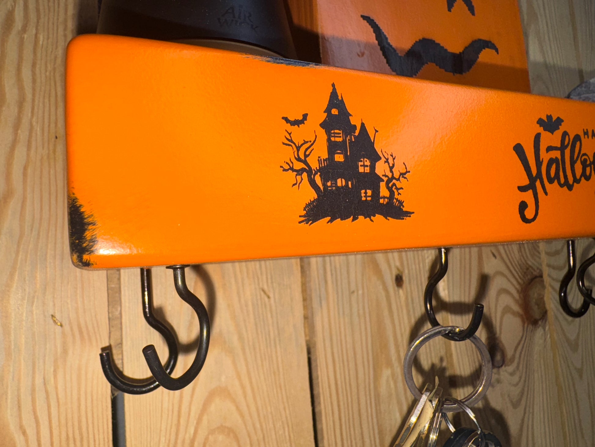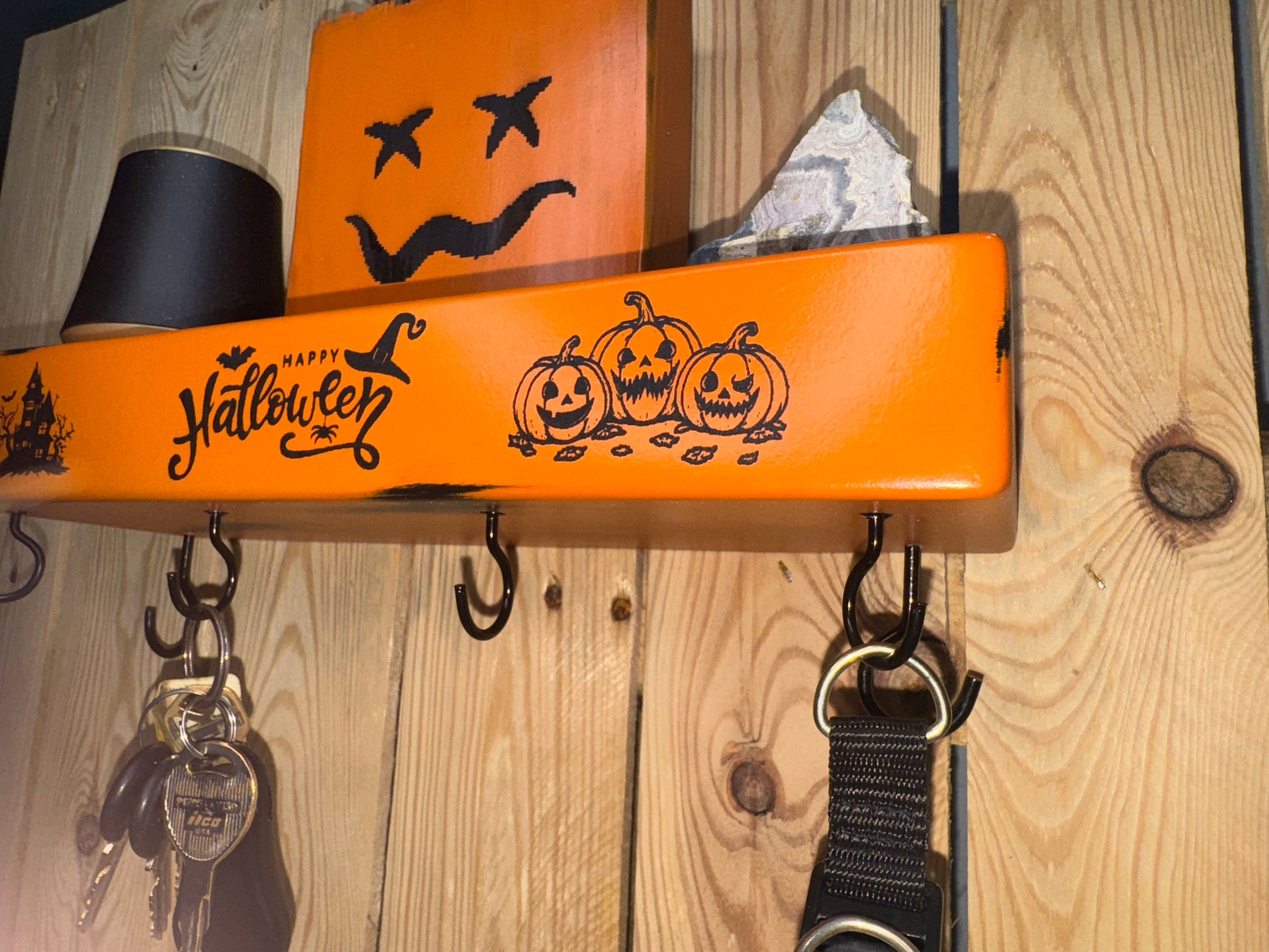 This Halloween floating shelf is handmade, painted, and laser engraved by me. Each shelf comes with a bracket and easy install hardware/directions.